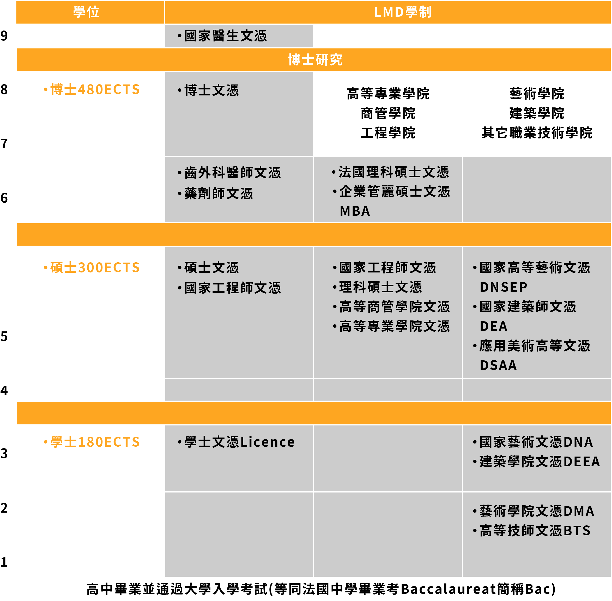 備註:高等學院預備班(CPGE)為準備進入高等學院者就讀,學制二年。